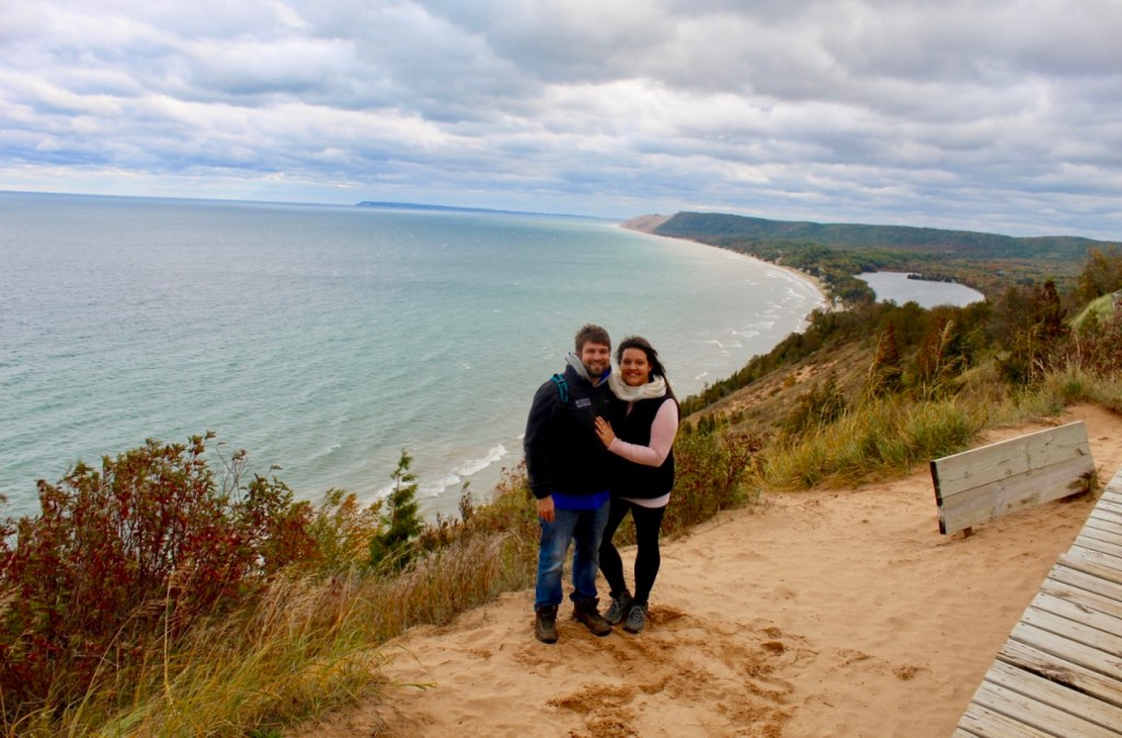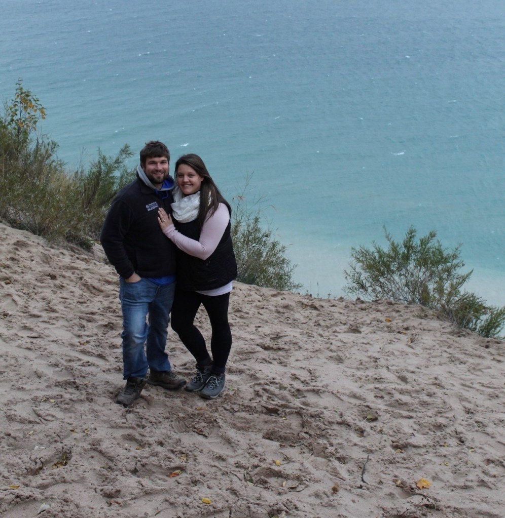 My Husband Jacob and I started dating 10/13/2014 we met at the dirty bird (Red Robin) where we worked at the time. It all started because my best friend had the balls to send him a Snapchat from my phone that said “wanna hangout sometime?” Thank you Tia.😘 Five years later on a hike at the sleeping bear dunes on 10/12/2019 Jacob popped the question and with no hesitation I said yes!